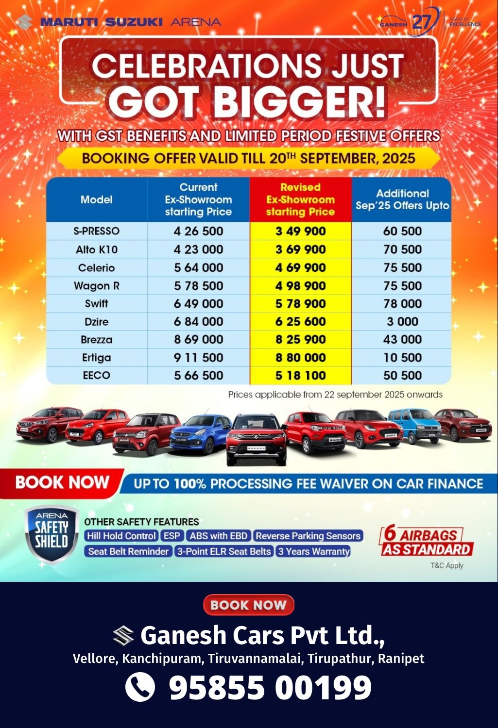 Maruti Suzuki ARENA – Ganesh Cars, New Bypass Road, Vellore, is your trusted Maruti Suzuki car showroom near Vellore Bus Stand, Katpadi, and VIT. We are an authorized ARENA car dealer in Tamil Nadu, offering the full range – Alto, WagonR, Swift, Dzire, Brezza, and Ertiga. Visit our ARENA showroom in Vellore for test drives, easy EMI plans, car exchange offers, car finance, and insurance support. Our showroom also stocks genuine Maruti accessories and provides expert buying assistance. If you're looking for a Maruti Suzuki ARENA showroom near me or a reliable Maruti dealer in Vellore, step into Ganesh Cars today.